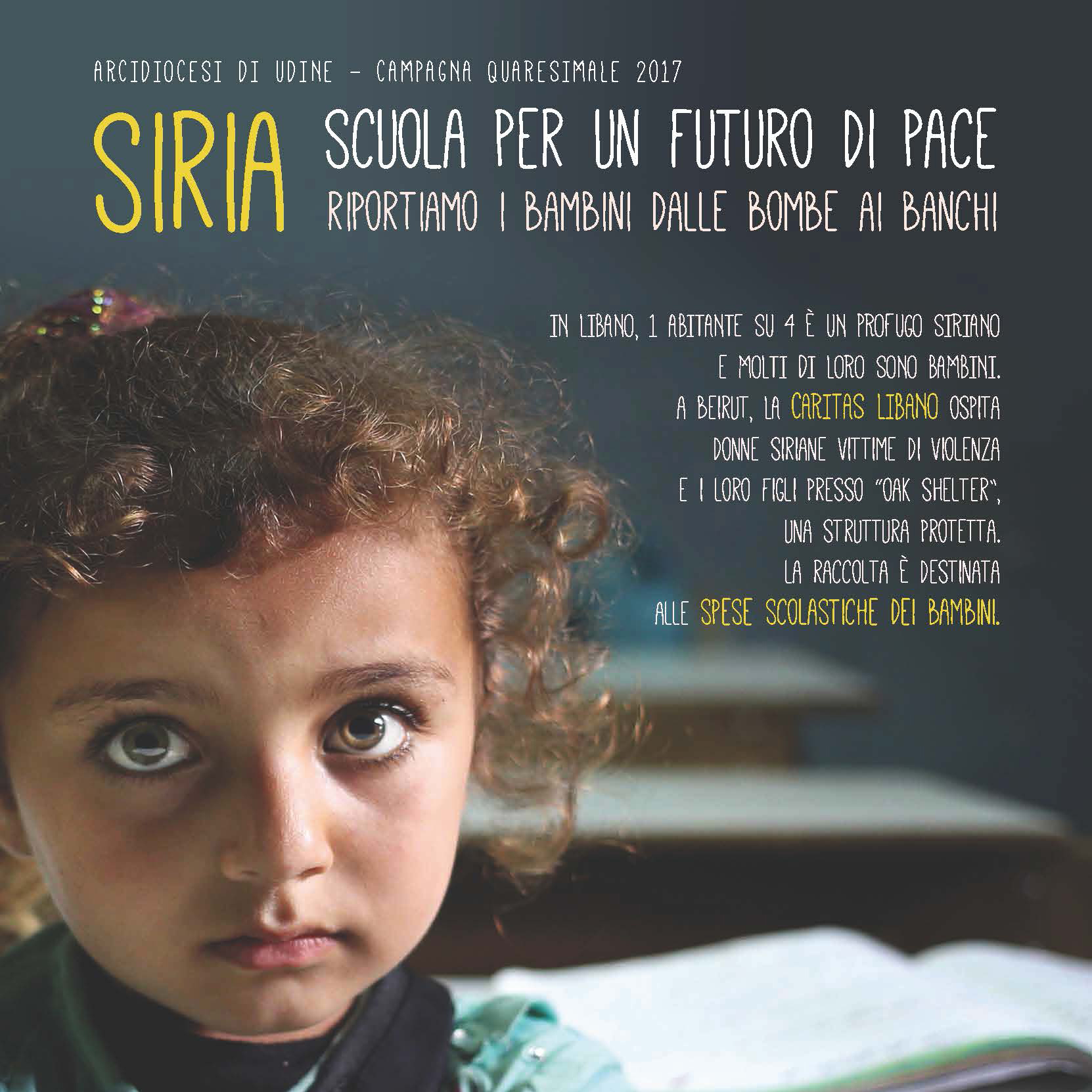 «Siria. Scuola per un futuro di pace, riportiamo i bambini dalle bombe ai banchi» è il titolo della Campagna quaresimale 2017 il cui obiettivo è sostenere i bambini siriani accolti in Libano dalla Caritas. Giovedì santo la tradizionale raccolta dei “salvadanai”