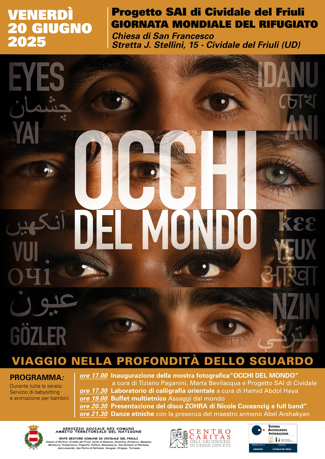 - alle 17 si terrà l’inaugurazione della mostra fotografica «Occhi del mondo» a cura di Tiziano Paganini, Marta Bevilacqua e del Progetto Sai di Cividale;