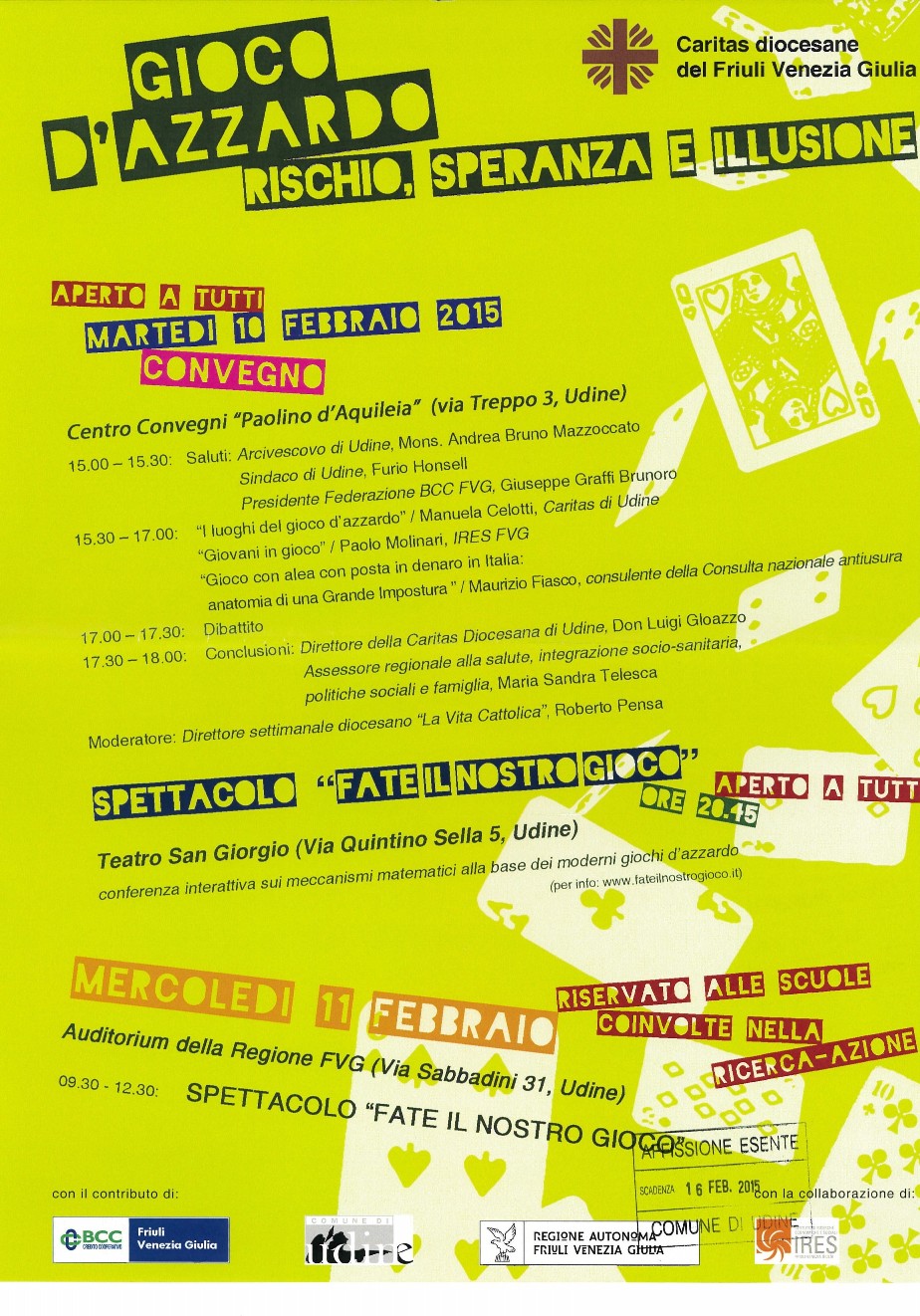 Gioco «d’azzardo. Rischio, speranza e illusione» è il titolo del convegno, organizzato dalle Caritas diocesane del Friuli-Venezia Giulia, che si terrà martedì 10 febbraio nel Centro convegni «Paolino d’Aquileia», a partire dalle ore 15.00. In serata, inoltre, conferenza interattiva.