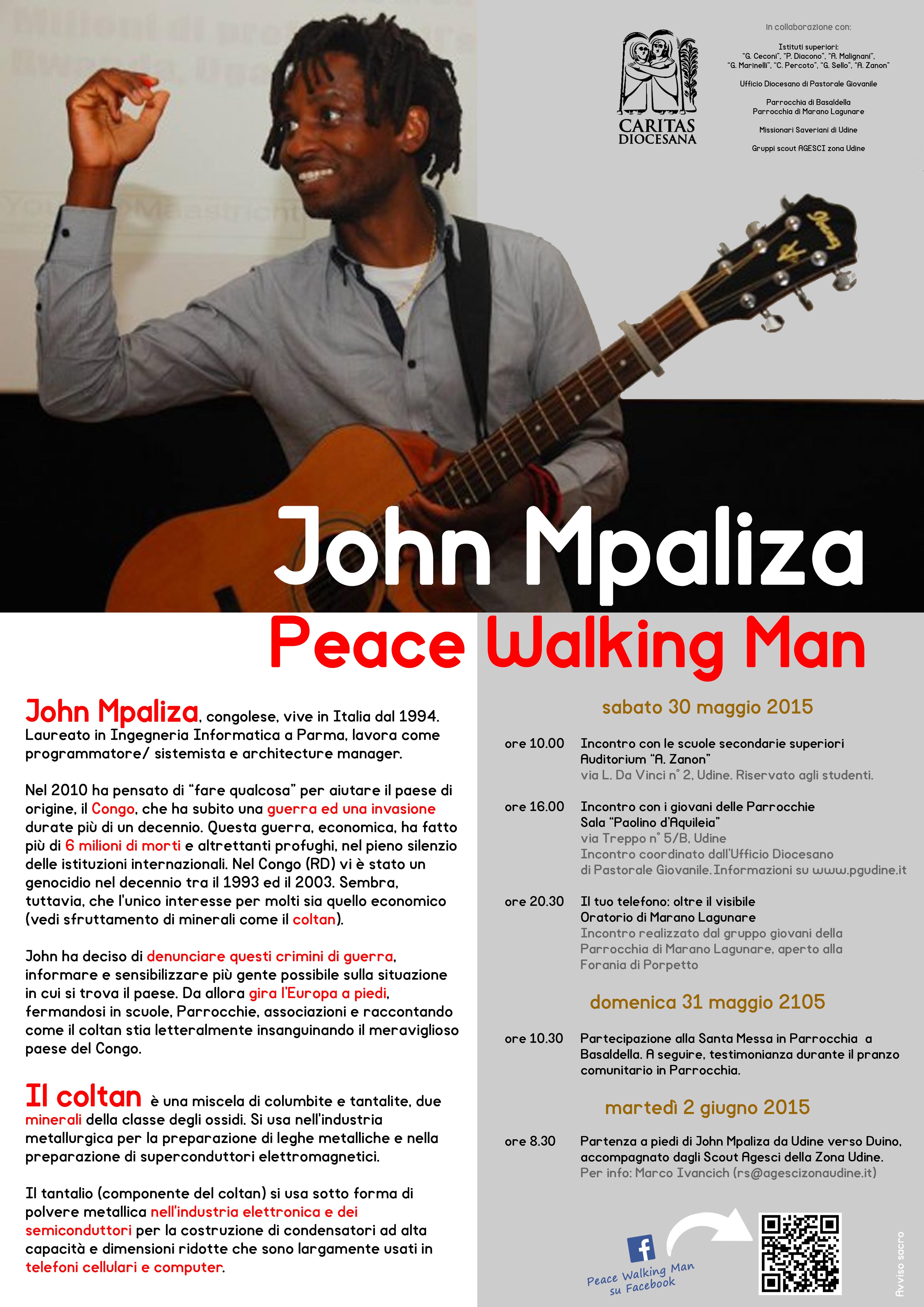 Dal 29 maggio al 2 giugno il «Peace Walking Man» – che da due anni attraversa a piedi l’Italia e l’Europa per far conoscere il dramma della guerra nella Repubblica Democratica del Congo – sarà a Udine. Ricco il calendario degli appuntamenti, John Mpaliza, infatti, incontrerà studenti e giovani delle parrocchie, per ripartire poi alla volta di Duino, accompagnato dagli Scout Agesci della Zona di Udine.
