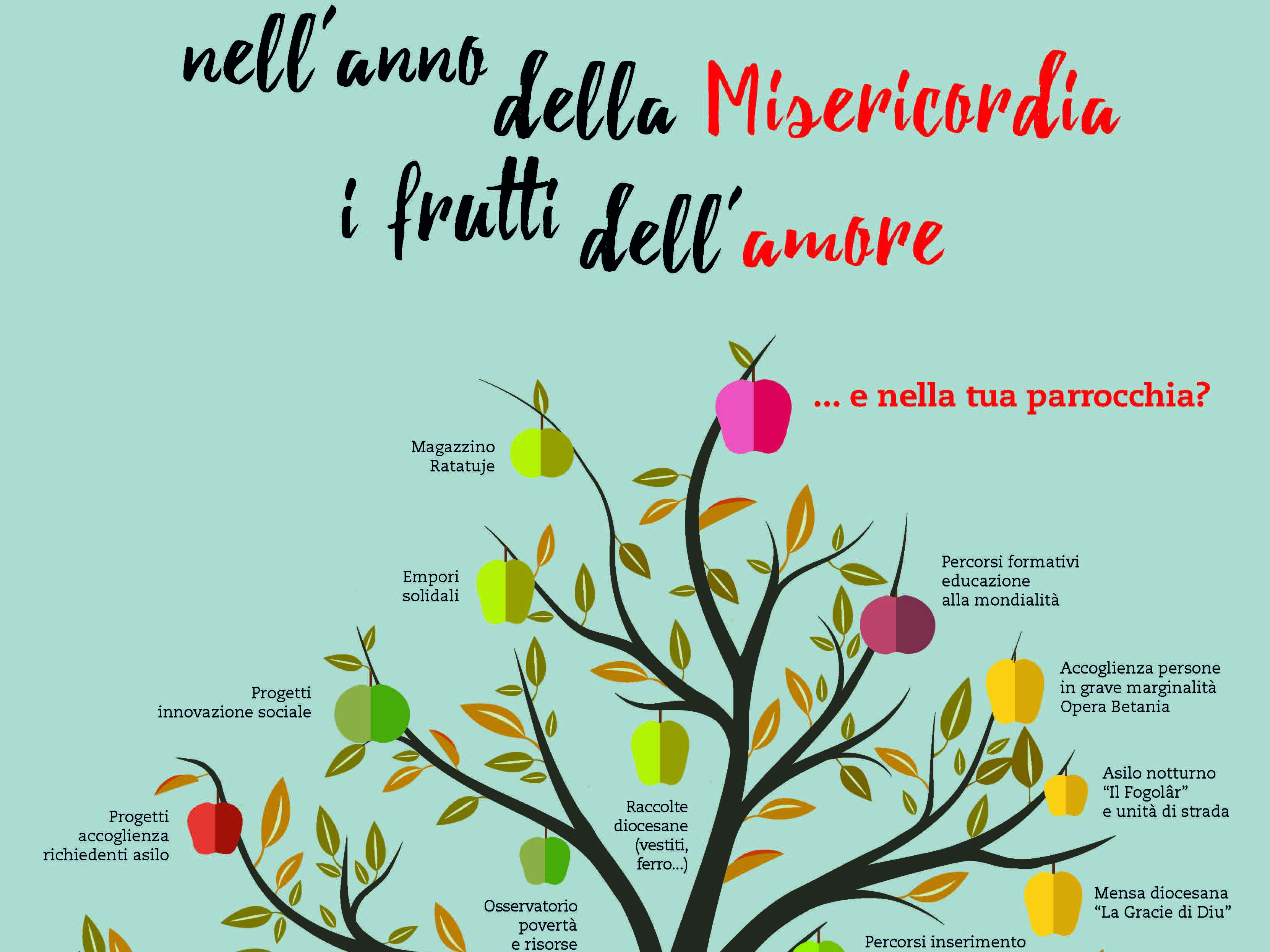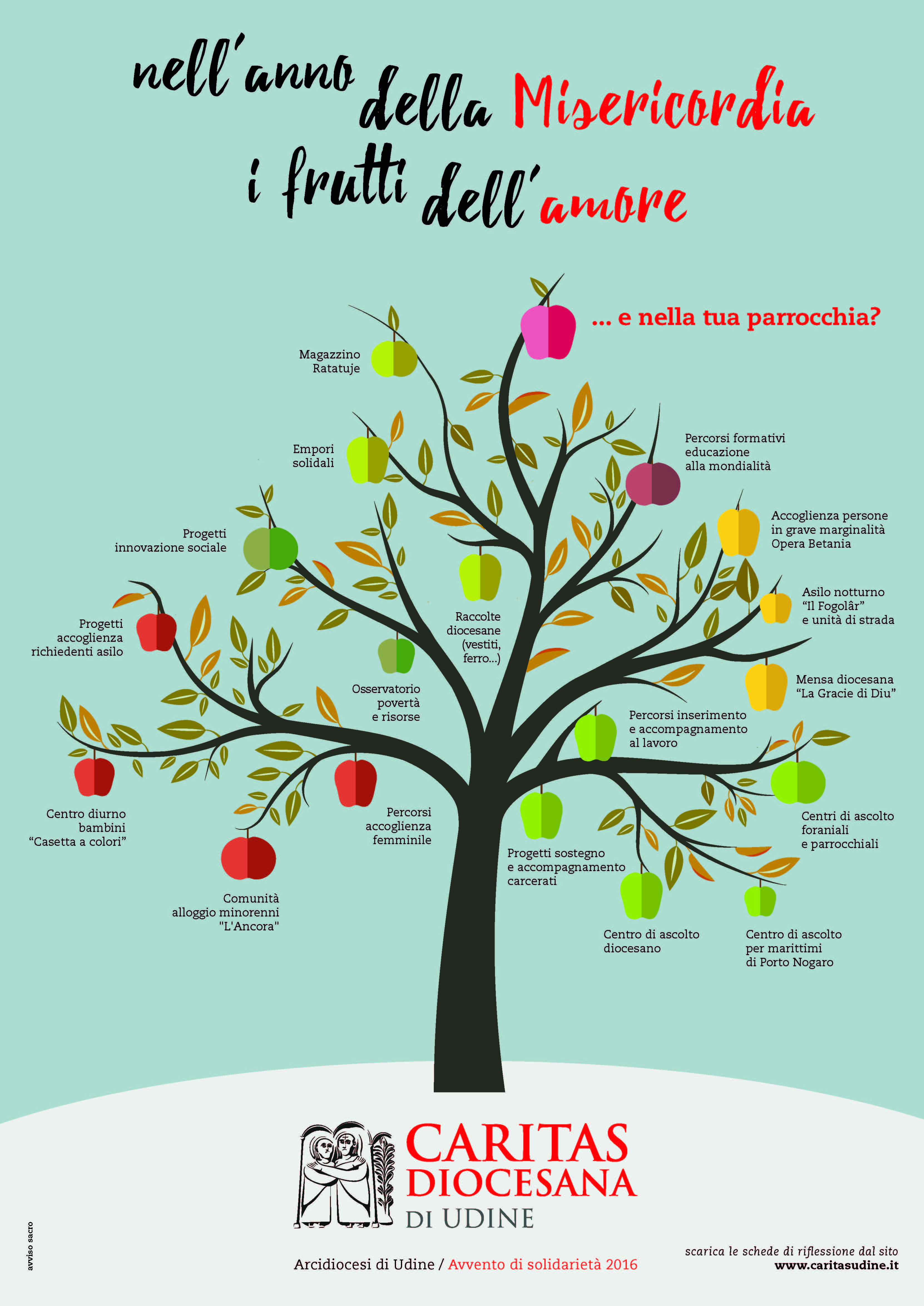 In occasione dell’Avvento, la Caritas diocesana di Udine propone alle comunità cristiane del territorio di proseguire la riflessione inaugurata con l’anno giubilare della Misericordia. La Caritas desidera favorire nelle parrocchie la consapevolezza di come nelle nostre comunità si concretizza il mandato evangelico dell’attenzione ai poveri, a cui Papa Francesco richiama con forza tutta la Chiesa. La locandina (qui accanto) preparata per l’Avvento 2016 propone quindi un albero i cui frutti corrispondono alle opere-segno realizzate nella nostra Diocesi dalla stessa Caritas e dalle realtà che alla Caritas fanno riferimento. L’albero in questo modo diventa anche una mappa e un invito alla riflessione sul tema della Misericordia, declinato in sei voci. Ad ogni voce corrisponderà una scheda di approfondimento, pubblicata sul sito della Caritas diocesana con il seguente calendario: