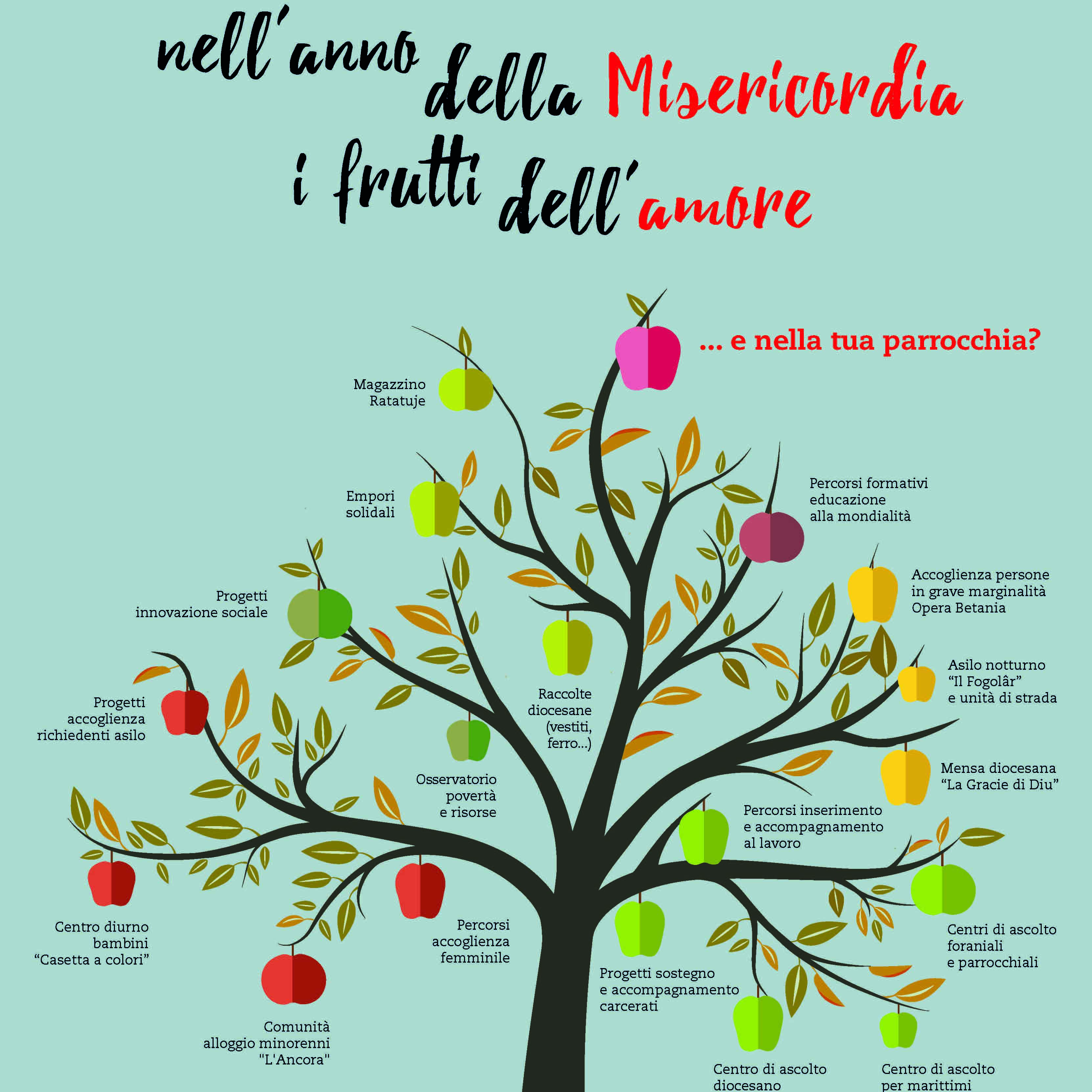 L’approfondimento grazie all’albero-mappa che porta con sé un invito alla riflessione sul tema della Misericordia, declinato in sei voci. Ad ogni voce corrisponderà una scheda di approfondimento, pubblicata sul sito della Caritas diocesana.