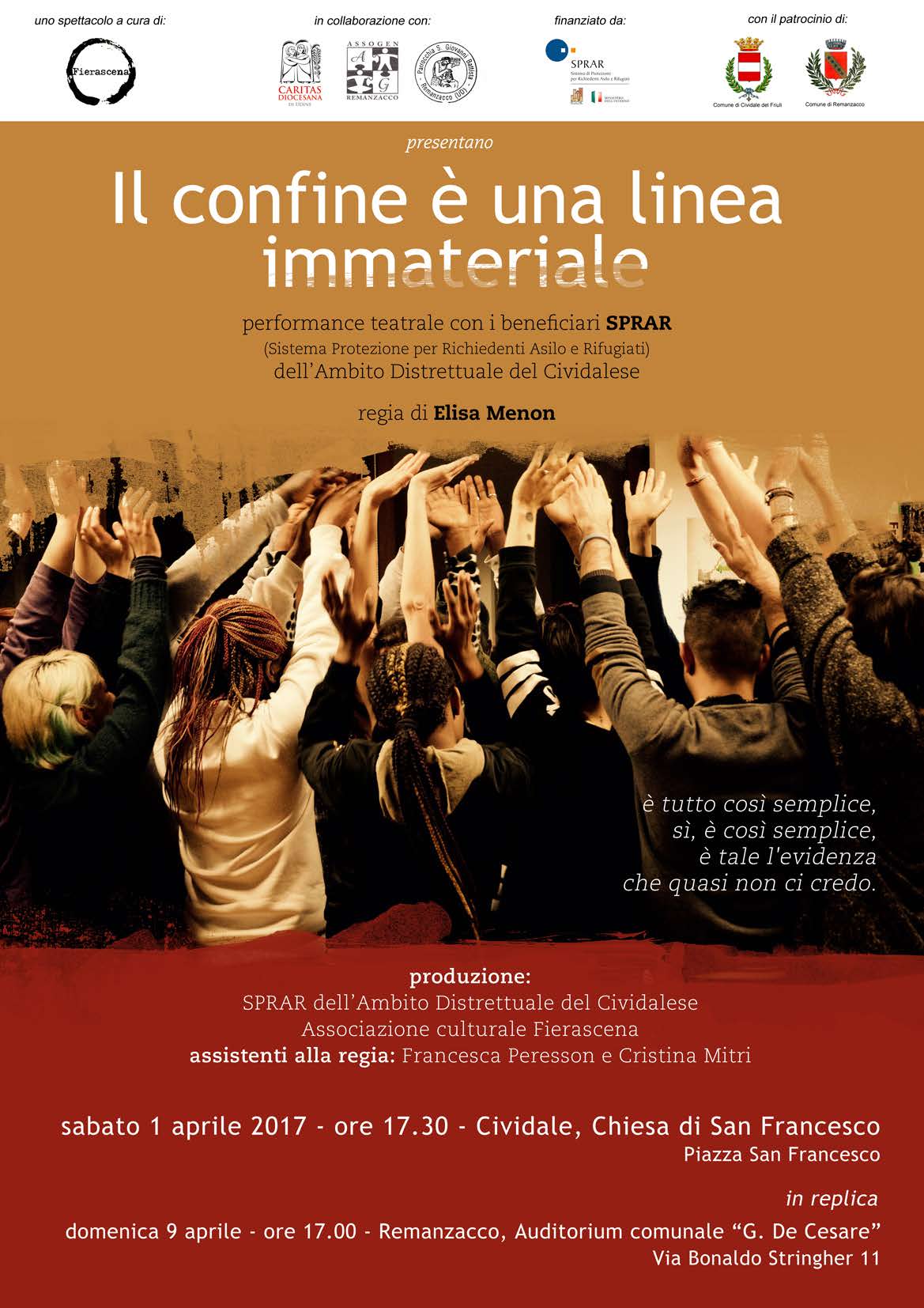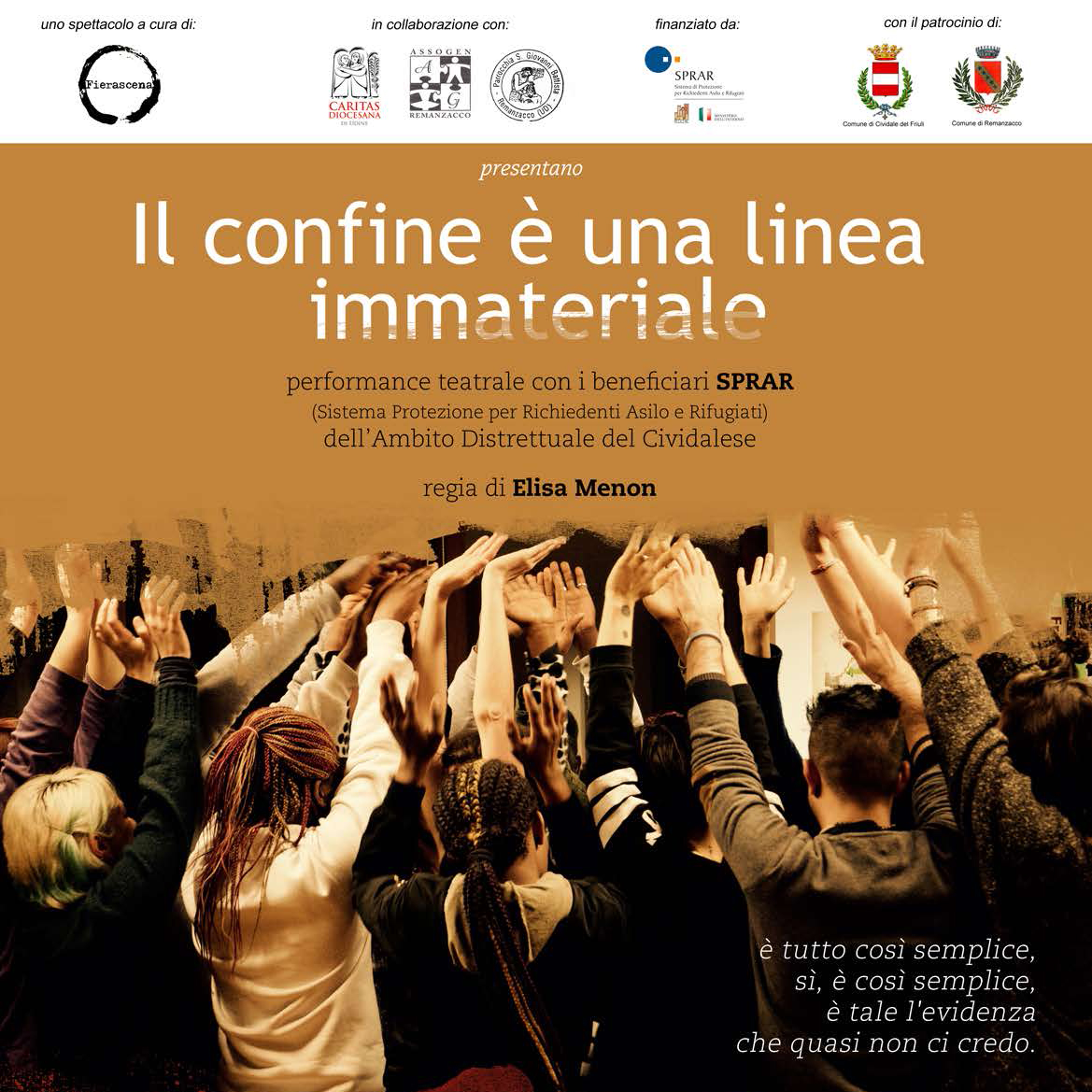 «Il confine è una linea immateriale» è il titolo dello spettacolo – curato dall’associazione Fierascena – che chiude il laboratorio che per tre mesi ha visto lavorare insieme sul tema del confine i profughi del progetto SPRAR del cividalese e i cittadini italiani che hanno voluto aderire al progetto