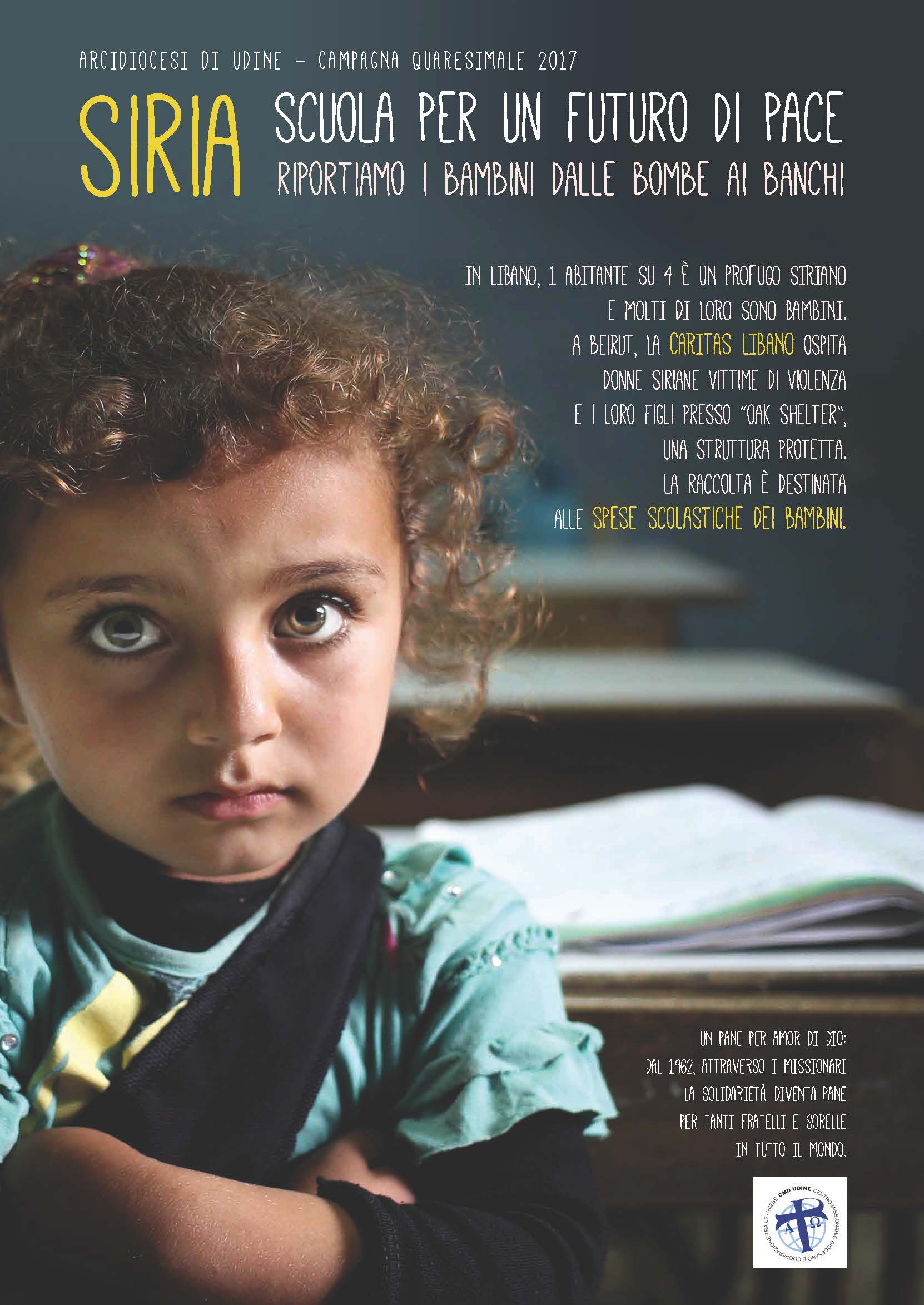 «Siria. Scuola per un futuro di pace, riportiamo i bambini dalle bombe ai banchi» è il titolo della Campagna quaresimale 2017 il cui obiettivo è sostenere i bambini siriani accolti in Libano dalla Caritas. Giovedì santo la tradizionale raccolta dei “salvadanai”