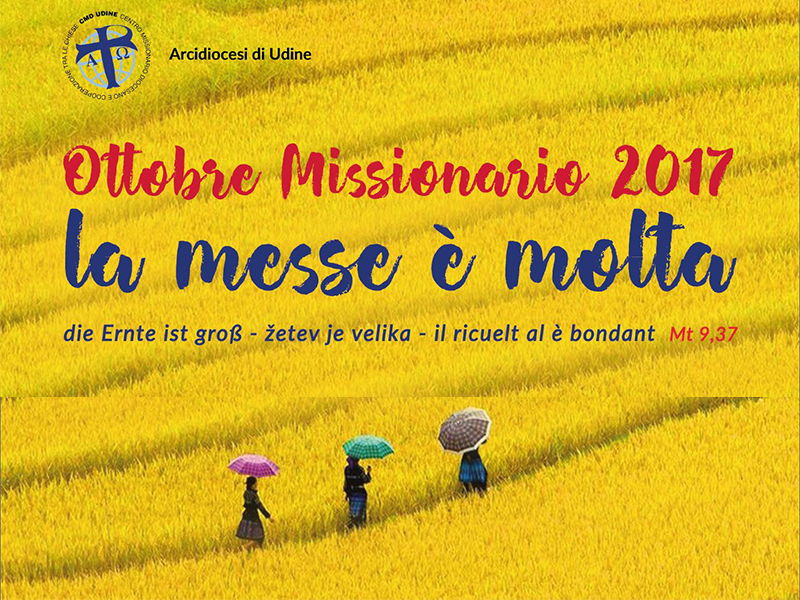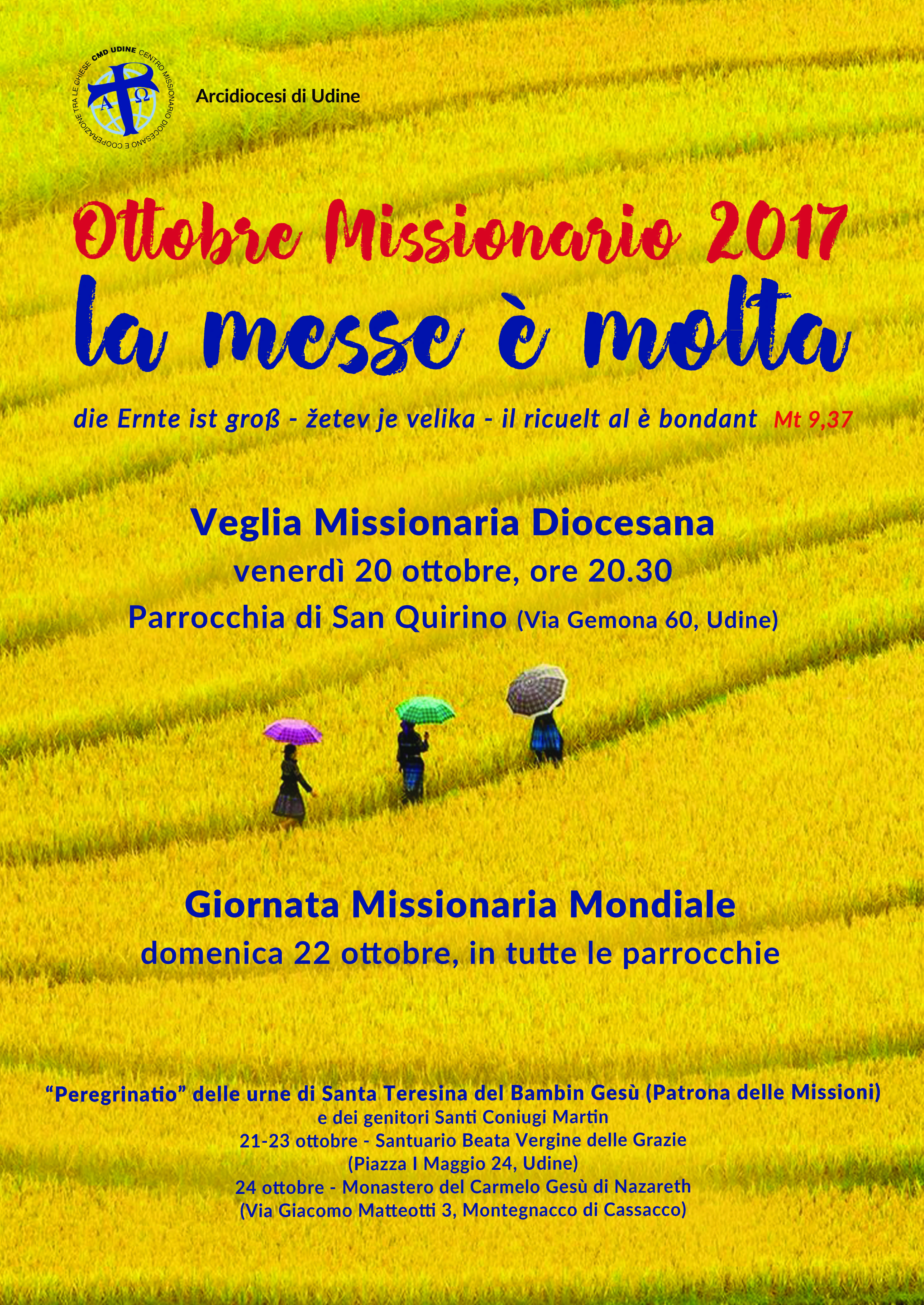 In comunione con la Chiesa universale anche in Diocesi si vivrà con particolare intensità questo mese, segno di grande vicinanza ai 175 missionari friulani che stanno portando l’annuncio nei cinque continenti. È in distribuzione a tutte le parrocchie il materiale per l’animazione. Inoltre, venerdì 20 ottobre alle ore 20.30 nella Parrocchia udinese di San Quirino (in via Gemona, 60), si terrà la Veglia missionaria guidata dall’arcivescovo, mons. Andrea Bruno Mazzocato. Non solo. Quest’anno ci sarà anche la «Peregrinatio» delle urne di Santa Teresa del Bambin Gesù, patrona delle missioni, e dei genitori Santi Coniugi Martin: dal 21 al 23 ottobre al santuario della Beata Vergine delle Grazie e il 24 ottobre al monastero del Carmelo di Nazareth, a Montegnacco di Cassacco. Sulle pagine del settimanale diocesano «la Vita cattolica» ogni settimana ci sarà il racconto di esperienze vive di missione e la riflessione sulle cinque parole che accompagnano questo cammino: contemplazione, vocazione, annuncio, carità, ringraziamento.