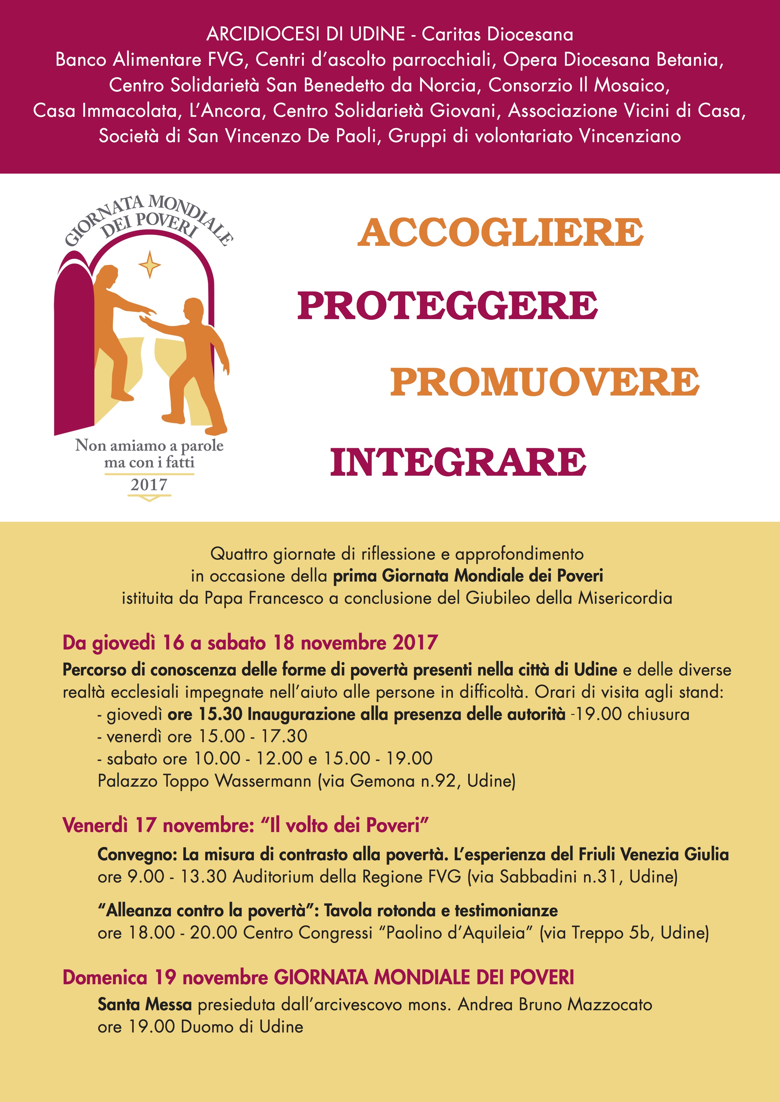 Venerdì 17 novembre due gli appuntamenti: alle ore 9, nellAuditorium della Regione FVG (via Sabbadini 31, Udine) il convegno su «La misura di contrasto alla povertà. L’esperienza del Friuli Venezia Giulia»; alle 18, al Centro culturale «Paolino d’Aquileia» (via Treppo 5/b, Udine) la tavola rotonda dal titolo «Alleanza contro la povertà». Domenica 19 novembre, alle 19, la Santa Messa in Cattedrale a Udine presieduta dall’arcivescovo di Udine, mons. Andrea Bruno Mazzocato. Sarà inoltre possibile visitare gli stand a Palazzo Di Toppo Wasserman venerdì dalle 15 alle 17.30 e sabato dalle 10 alle 12 e dalle 15 alle 19.