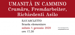 “Umanità in cammino / Cramârs, Fremdarbeiter, Richiedenti Asilo”: è il titolo dell’incontro, programmato sabato 4 gennaio dalla Pro loco di Ravascletto, Salârs e Zovello, in concomitanza con gli ultimi giorni di apertura del “Presepio dei Cramârs / Die Krämerkprippe”.