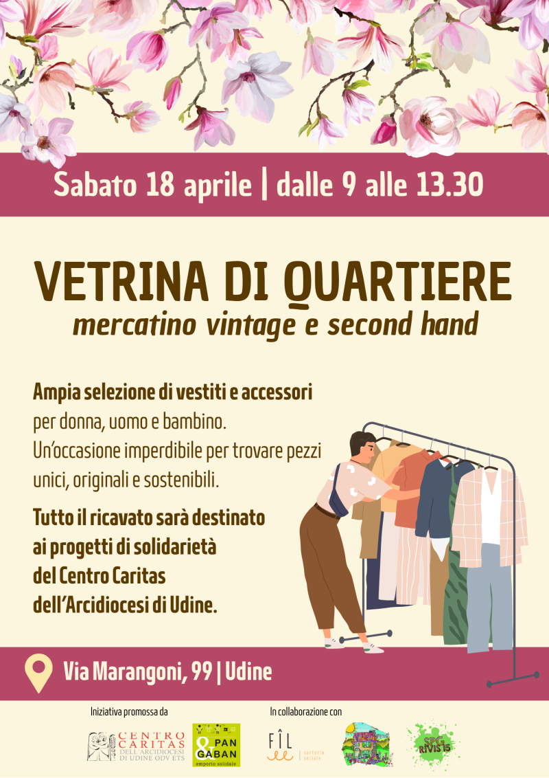 Torna Vetrina di Quartiere, l’amatissimo mercatino vintage e second hand dell’emporio solidale Pan&Gaban. L’appuntamento è per sabato 18 aprile – dalle 9 alle 13.30, a Udine, al civico 99 di via Marangoni –, come sempre si potranno trovare selezionatissimi abiti usati, pezzi unici e originali. Il tutto a fronte di un’offerta libera, il ricavato sarà destinato alle diverse progettualità di solidarietà della Fondazione Centro Caritas di Udine. In caso di mal tempo l’iniziativa è rinviata a data da destinarsi.